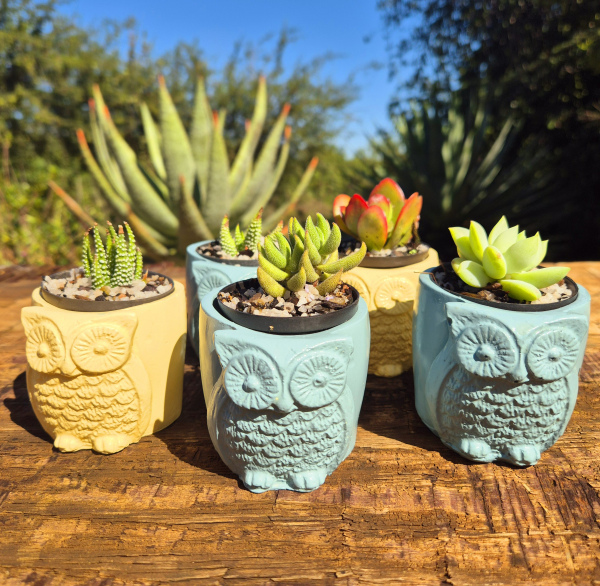 This charming, handcrafted owl pot brings a touch of whimsical wisdom to any space. Inside, a resilient succulent asks for little more than a sip of water and some sunshine every now and then, making it the perfect low-maintenance companion for your bathroom counter or a delightful gift for the plant-and-owl-obsessed.